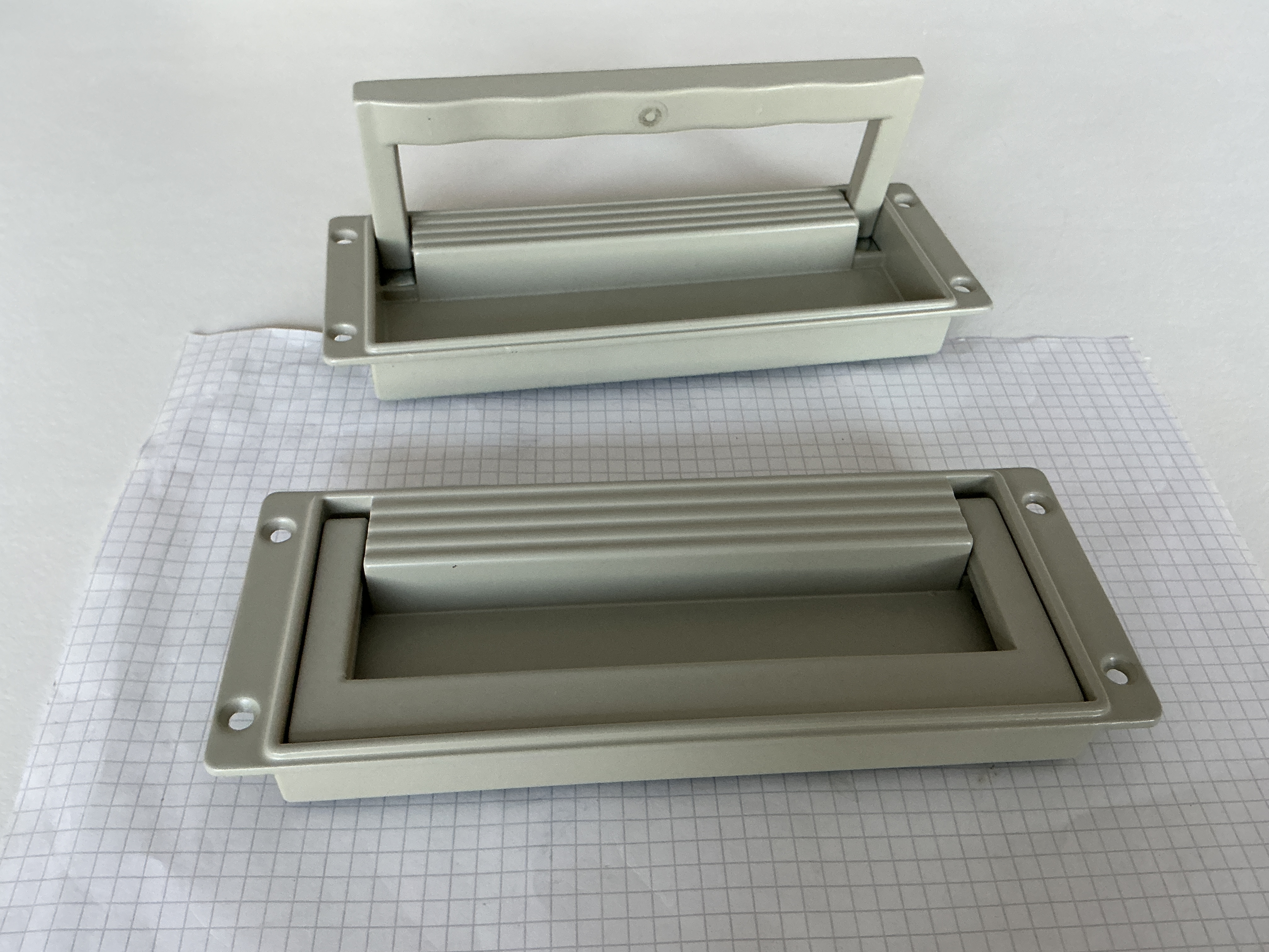 Metalen Inbouw handgrepen set 195mm x 75mm verzonken met veersysteem en dempingsrubber.